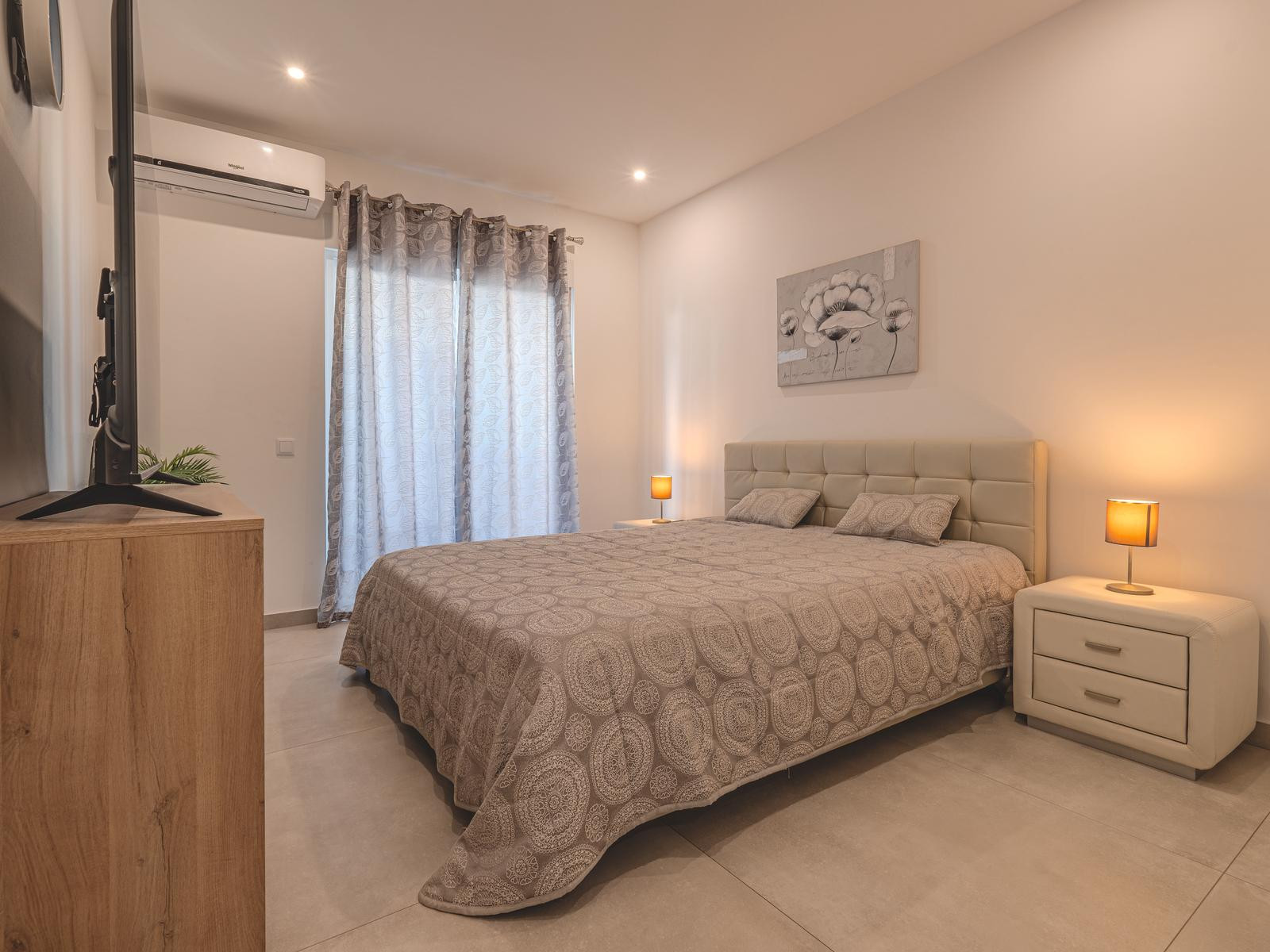 The apartment in Quarteira has 2 bedroom(s) and capacity for 6 person(s). Accommodation of 248 m² cosy and modern, located on the first beach line, with sea views. It is located 0 m from the city, 0 m from the amusement park, 5 m from the sandy beach, 10 m from Rocha beach, 10 m, 20 m, 20 m from the supermarket, 100 m from the bus station, 2 km from the Golf course, 3 km from the water park, 3 km, 8 km from the train station, 10 km from the airport and located in an ideal zone for families and next to the sea. It has lift, garden furniture, barbecue, ironing board, internet access (wifi), hair dryer, balcony, air conditioning, 3 TVs, satellite TV (Languages: English). The electric kitchenette is equipped with fridge, microwave, oven, freezer, crockery/cutlery, kitchen utensils, coffee machine, fryer, toaster, electric jug and juice machine.